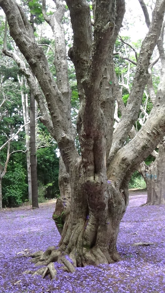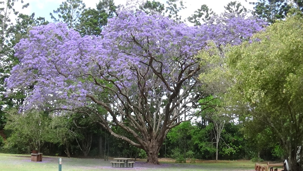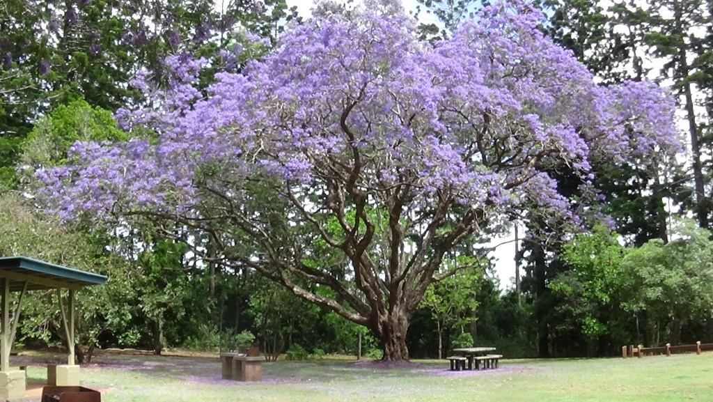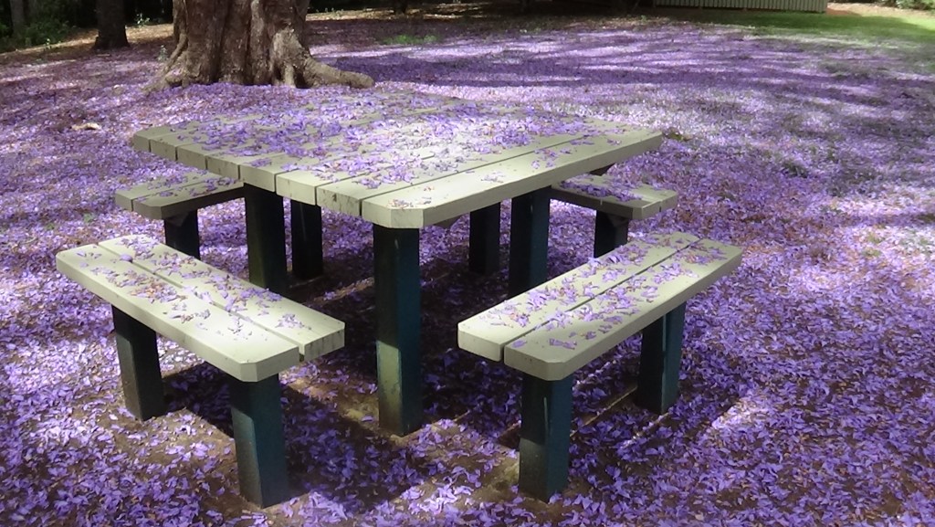 The park is situated in the middle of a large (thousands of acres) pine tree plantation area and very rarely gets used these days, although a lady and her dog obviously slept there last night. The Jacaranda trees, by looking at their size and shape, have been there for some time, but the color (colour) of their flower petals is just amazing. The bright green leaves will form as soon as the flowers die away, making it a very good shade tree.